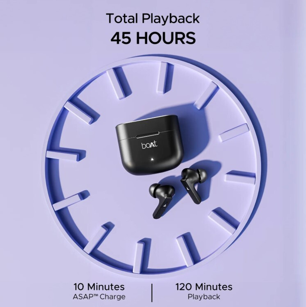 The boAt Airdopes 91 are wireless true wireless earbuds delivering up to 45 hours of playtime with the charging case. They feature large 10mm drivers with boAt Signature Sound for deep bass and clear highs, dual mics with ENx noise cancellation tech for crystal-clear calls, and BEAST Mode with 50ms low latency for gaming. With IPX4/5 water and sweat resistance, ASAP Charge technology (10 min charge = 120 min playback), and Bluetooth 5.3 with Insta Wake N’ Pair, these earbuds are designed for versatile everyday use including workouts, gaming, and calls.